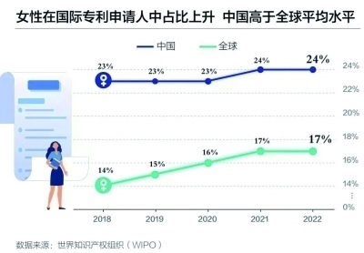 世界知識產(chǎn)權(quán)組織數(shù)據(jù)顯示,2021年,中國是全球國際專利(PCT)女性申請人的最大來源地。2022年,中國女性發(fā)明者所占比例為24%,高于全球平均水平。