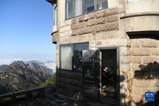 4月20日,秦志平在黃山風(fēng)景區(qū)對(duì)林火監(jiān)測(cè)系統(tǒng)進(jìn)行巡看。