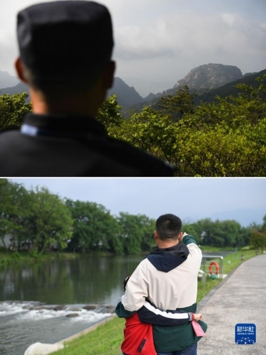 這是一張拼版照片。上圖:秦志平在黃山之巔俯視山腳,看向家的位置(5月8日攝);下圖:在安徽省黃山市黃山區(qū),休假中的秦志平(右)和女兒秦靖妍散步途中,指著黃山的方向,告訴女兒自己守護(hù)山林的故事(5月7日攝)。