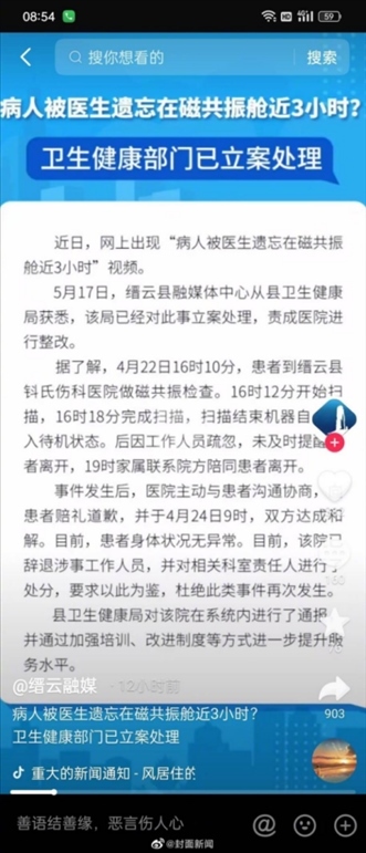 ·官方通報“病人被遺留磁共振艙3小時事件”:雙方已和解,涉事人員被辭退。