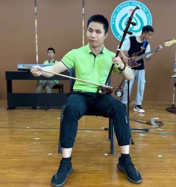 2021年,先天性失明的毛歡笑來到蕪湖市盲人學(xué)校后,沒有錯過黑眼睛樂隊(duì)在校園里的任何一次演出。