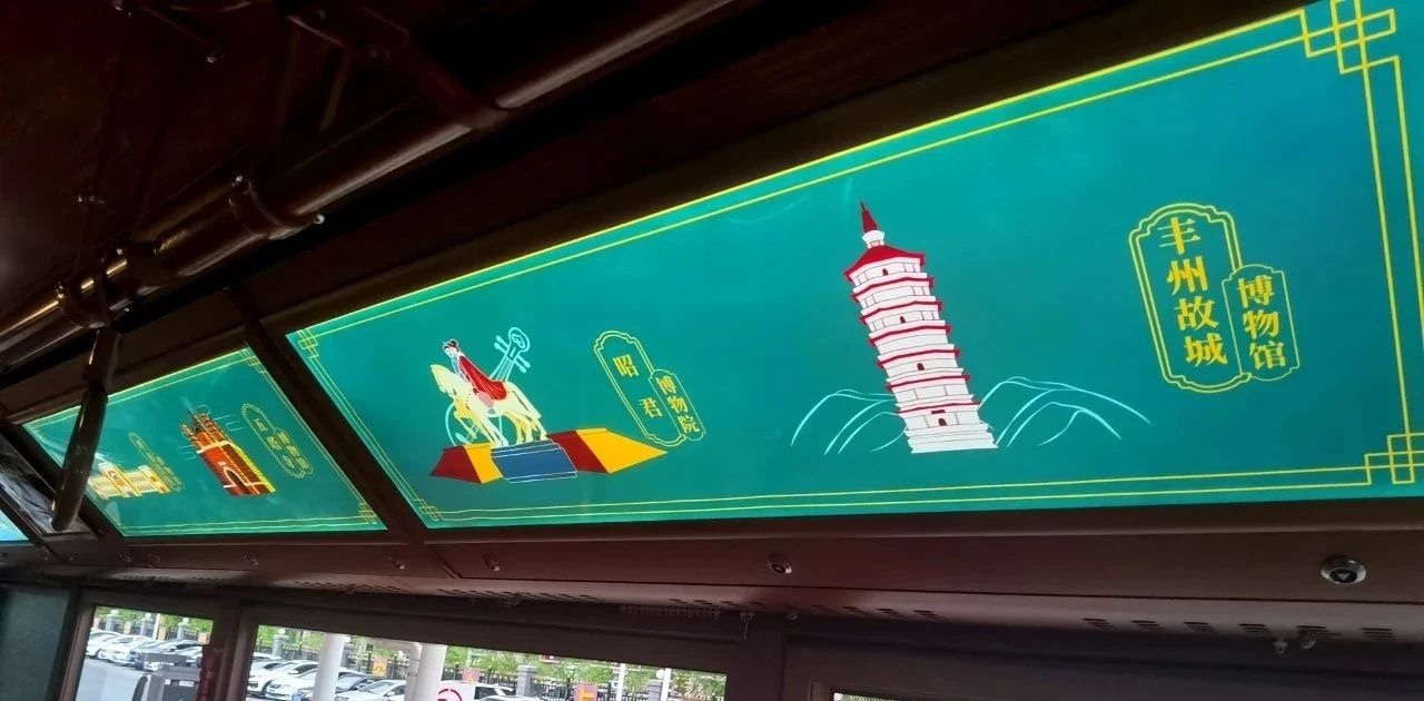 除了復(fù)古風(fēng)的車身外型,主題車廂內(nèi)也充滿了如詩(shī)如畫的文旅元素,為乘客們顯示了五塔寺、昭君博物院、豐州故城博物館等本土旅游勝地,乘坐鐺鐺車,乘客在瀏覽美麗街景的同時(shí),也可通過車內(nèi)看板了解到青城的名勝古跡。
