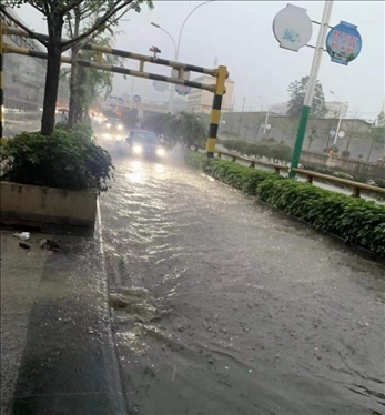 暴雨過后,城市道路積水嚴(yán)重,城區(qū)出現(xiàn)內(nèi)澇,市民蹚水出行。
