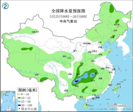 全國降水量預(yù)報圖(5月25日08時-26日08時)