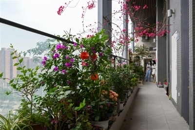 ■ 在這面美麗的花墻背后,是小區(qū)開(kāi)發(fā)商和樓棟240戶人家,共同打造出的花草童話——由開(kāi)發(fā)商種植的三角梅在交房時(shí)一并移交給業(yè)主,業(yè)主在門(mén)口的公共空間打造屬于自己的“小花園”。10年時(shí)間過(guò)去,240戶居民打造出了32層高的三角梅,還有繡球、蝴蝶蘭、多肉等綠植,櫻桃樹(shù)、桃樹(shù)、葡萄藤等水果植物,花椒、大蒜、番茄、西蘭花等蔬菜。