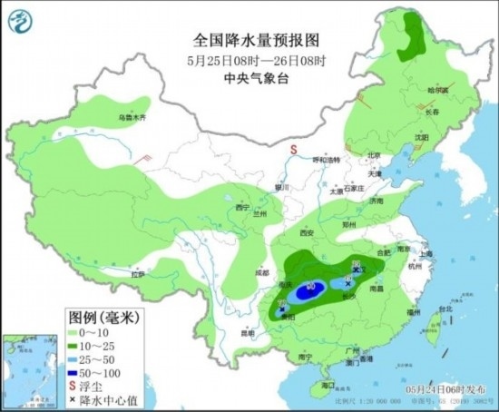 5月25日08時至26日08時,內蒙古東北部、黑龍江西北部、江漢、江南北部、西南地區(qū)東部等地部分地區(qū)有中到大雨,其中,湖南西北部、重慶東南部、貴州中部和東北部等地部分地區(qū)有暴雨(50~90毫米)。內蒙古中東部、黑龍江東南部、吉林中部、遼寧東部、新疆南疆盆地、河北北部等地部分地區(qū)有5~6級風。此外,內蒙古西部的部分地區(qū)有揚沙或浮塵天氣。