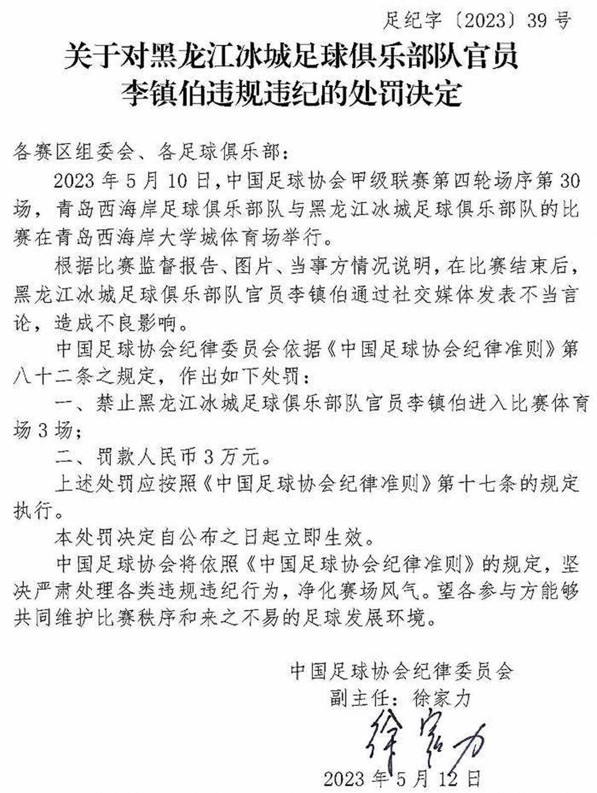 中國(guó)足協(xié)紀(jì)律委員會(huì)根據(jù)裁判員報(bào)告、比賽監(jiān)督報(bào)告、視頻、當(dāng)事方情況說明及聽證,認(rèn)定楊帆實(shí)施暴力行為,于是依據(jù)《中國(guó)足球協(xié)會(huì)紀(jì)律準(zhǔn)則》第五十三條、第四十八條之規(guī)定,對(duì)他給予停賽4場(chǎng)、罰款人民幣4萬(wàn)元的處罰。在這張罰單上,第一次出現(xiàn)了徐家力的名字。從這張罰單來看,中國(guó)足協(xié)紀(jì)律委員會(huì)定下了基調(diào),那就是嚴(yán)厲打擊球場(chǎng)暴力行為。