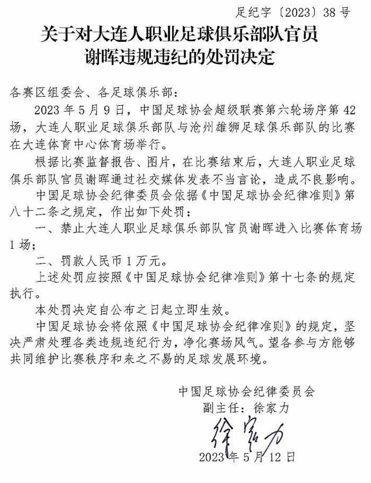 5月12日,中國(guó)足協(xié)紀(jì)律委員會(huì)接連開出三張罰單,對(duì)中超大連人隊(duì)的主教練謝暉,以及南通支云隊(duì)、黑龍江冰城隊(duì)的兩位俱樂部官員范兵和李鎮(zhèn)伯進(jìn)行了處罰,共計(jì)罰款5萬(wàn)元,并對(duì)三人追加禁賽。這三張罰單一出,引來外界的一片質(zhì)疑聲。