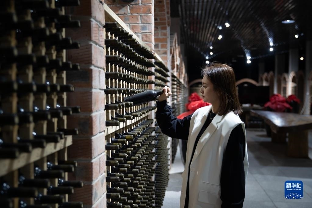 5月19日,在越橘莊園酒窖內(nèi),工作人員在檢查藍(lán)莓酒儲藏情況。