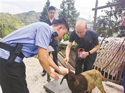 圖②:執(zhí)行干警對(duì)稱重后的山羊進(jìn)行標(biāo)記。