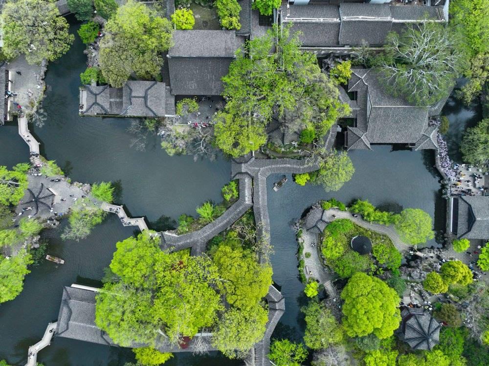 這是2023年4月5日拍攝的江蘇蘇州拙政園一景(無人機照片)。新華社記者 李博 攝