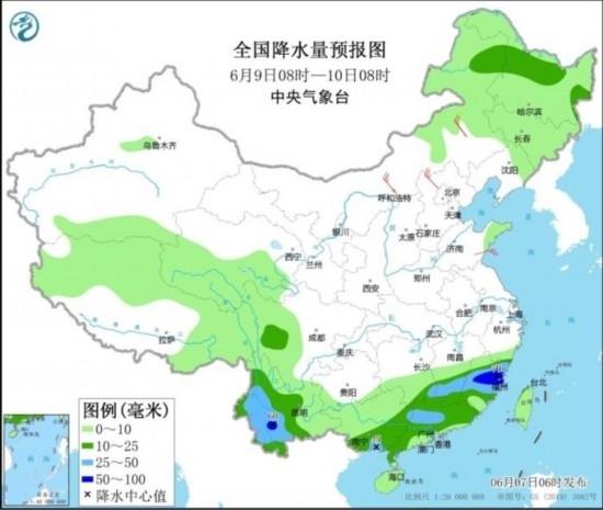圖3 全國降水量預(yù)報圖(6月9日08時-10日08時)