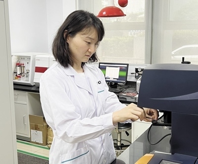 南京市產(chǎn)品質(zhì)量監(jiān)督檢驗(yàn)院綠色可降解材料質(zhì)檢中心副主任朱南幫企業(yè)做測(cè)試實(shí)驗(yàn)。蔣若晗攝