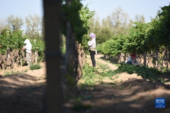 6月21日,在河北省懷來縣長城桑干酒莊葡萄種植基地,當?shù)剞r民在田間勞作。