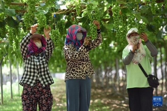 6月21日,在河北省懷來縣的豐禾葡萄基地,當?shù)剞r民在進行葡萄管理。