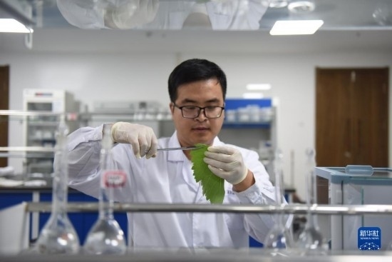 6月21日,在位于河北省懷來縣的河北省葡萄產業(yè)技術研究院,來自天津農學院的研究生韓亞奇正在分析葡萄葉的健康狀況。