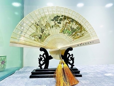 鄭士儒牙雕平刻作品《春夜宴桃李園圖》扇子。本報記者 張翼攝
