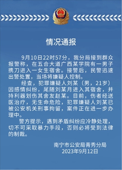 ·廣西外國語學(xué)院發(fā)生持刀傷人事件,警方通報:進(jìn)女寢持刀傷人男生已被刑拘。