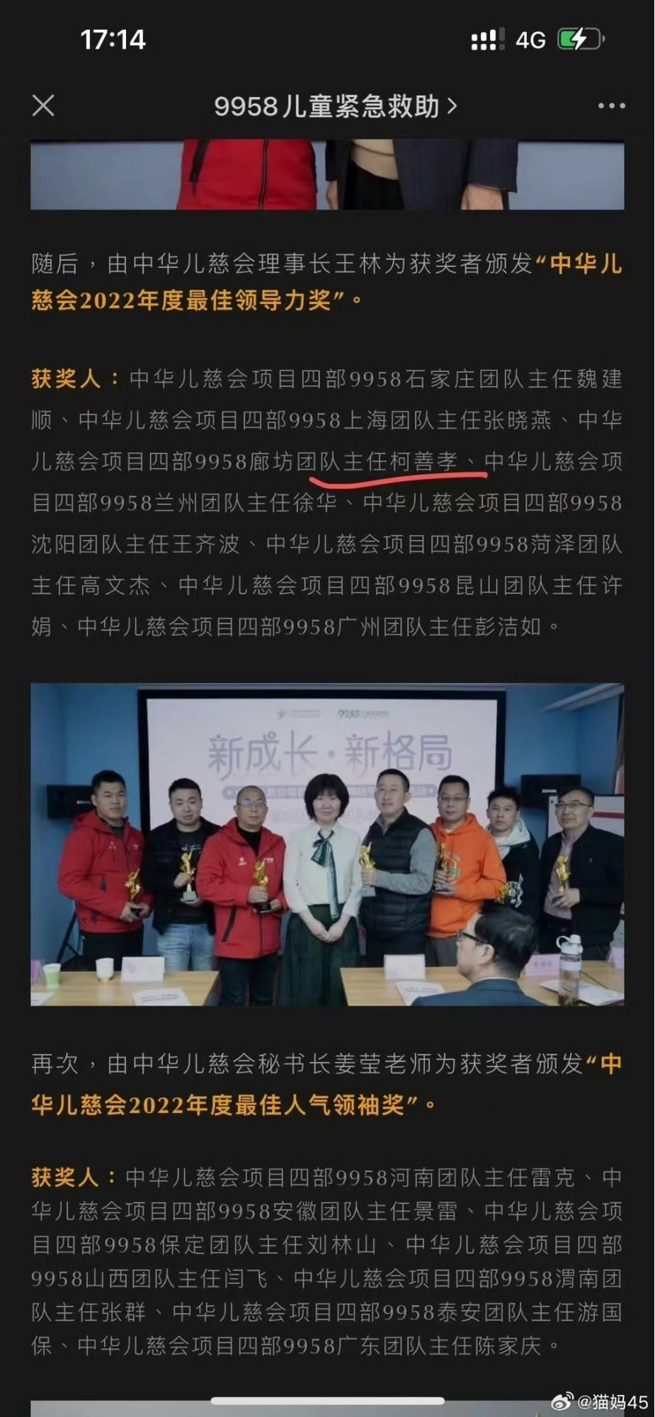 但對(duì)這份聲明,被騙家屬們并不認(rèn)同。首先是涉案人員柯某孝的身份問題,此前中華兒慈會(huì)官方公眾號(hào)顯示,柯某孝為“中華兒慈會(huì)項(xiàng)目四部9958廊坊團(tuán)隊(duì)主任”,獲“中華兒慈會(huì)2022年度最佳領(lǐng)導(dǎo)力獎(jiǎng)”。目前,中華兒慈會(huì)官方公眾號(hào)文章已對(duì)這些內(nèi)容進(jìn)行修改或刪除。