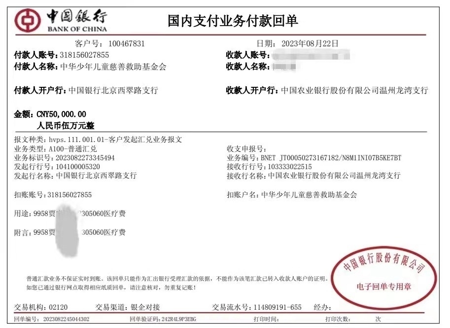 一位患者家屬提供給記者的銀行轉(zhuǎn)賬記錄顯示,8月22日的一張銀行的付款回單上,付款人名稱為:中華少年兒童慈善救助基金會(huì),收款人名稱為患者家屬陳某某,單據(jù)上標(biāo)注的用途為某某某醫(yī)藥費(fèi)等字樣。收款金額為5萬元。