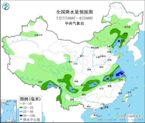 預(yù)計(jì),7月5日08時(shí)至6日08時(shí),內(nèi)蒙古東北部、黑龍江中南部以及云南西部、重慶中部、浙江北部等地部分地區(qū)有大到暴雨,其中,內(nèi)蒙古東北部局地有大暴雨(100~110毫米)。上述部分地區(qū)伴有短時(shí)強(qiáng)降水(最大小時(shí)降雨量20~50毫米,局地可超過60毫米),局地有雷暴大風(fēng)等強(qiáng)對(duì)流天氣。中央氣象臺(tái)7月5日06時(shí)繼續(xù)發(fā)布暴雨藍(lán)色預(yù)警。