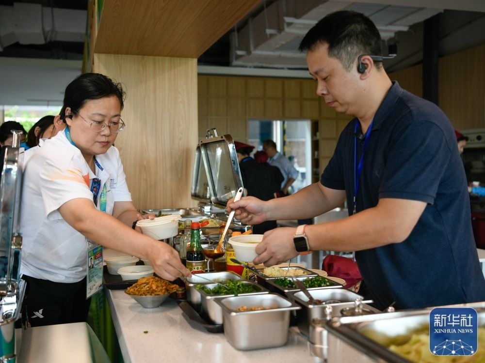 ↑7月14日,工作人員在成都大運(yùn)會主媒體中心媒體餐廳內(nèi)就餐。新華社記者 胥冰潔 攝