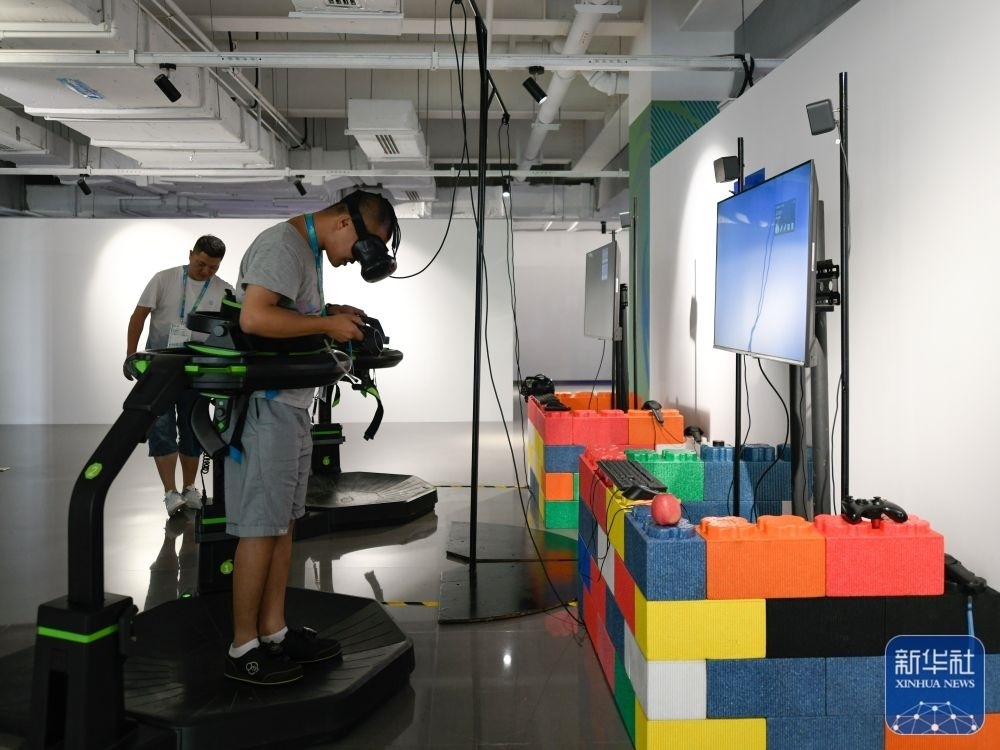 ↑7月14日,媒體工作人員在成都大運(yùn)會主媒體中心休閑娛樂區(qū)內(nèi)體驗VR游戲。新華社記者 胥冰潔 攝