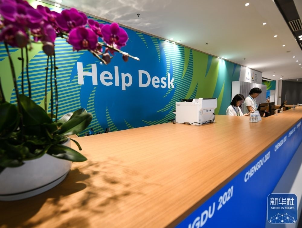 ↑7月13日,在成都大運(yùn)會主媒體中心,工作人員正在服務(wù)臺工作。新華社記者 王曦 攝
