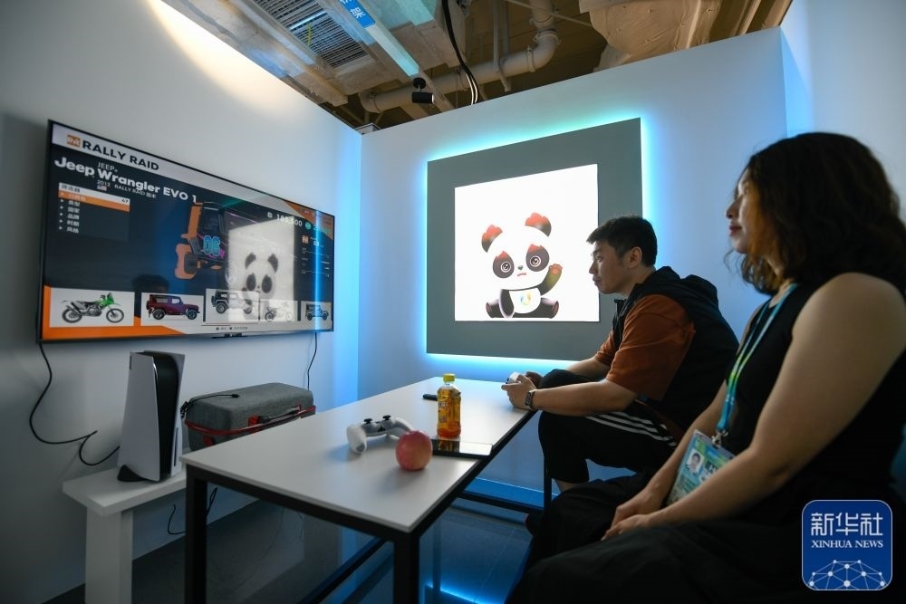 ↑7月14日,媒體工作人員在成都大運(yùn)會主媒體中心休閑娛樂區(qū)內(nèi)游玩。新華社記者 胥冰潔 攝