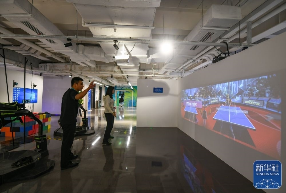 ↑?7月13日,在成都大運(yùn)會主媒體中心的休閑娛樂區(qū),兩名媒體記者在體驗互動投影乒乓球。新華社記者 王曦 攝