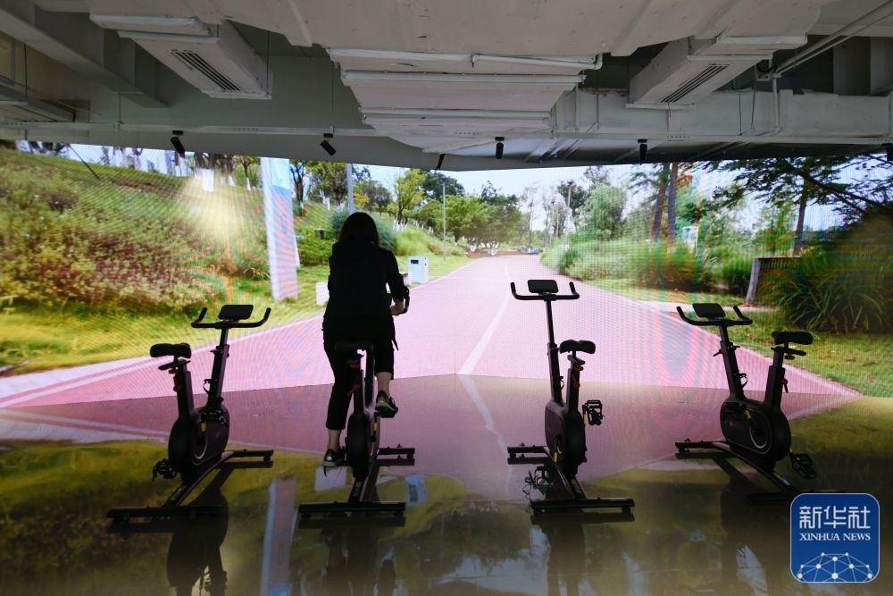 ↑7月14日,媒體工作人員在成都大運(yùn)會主媒體中心休閑娛樂區(qū)內(nèi)體驗騎行。新華社記者 胥冰潔 攝