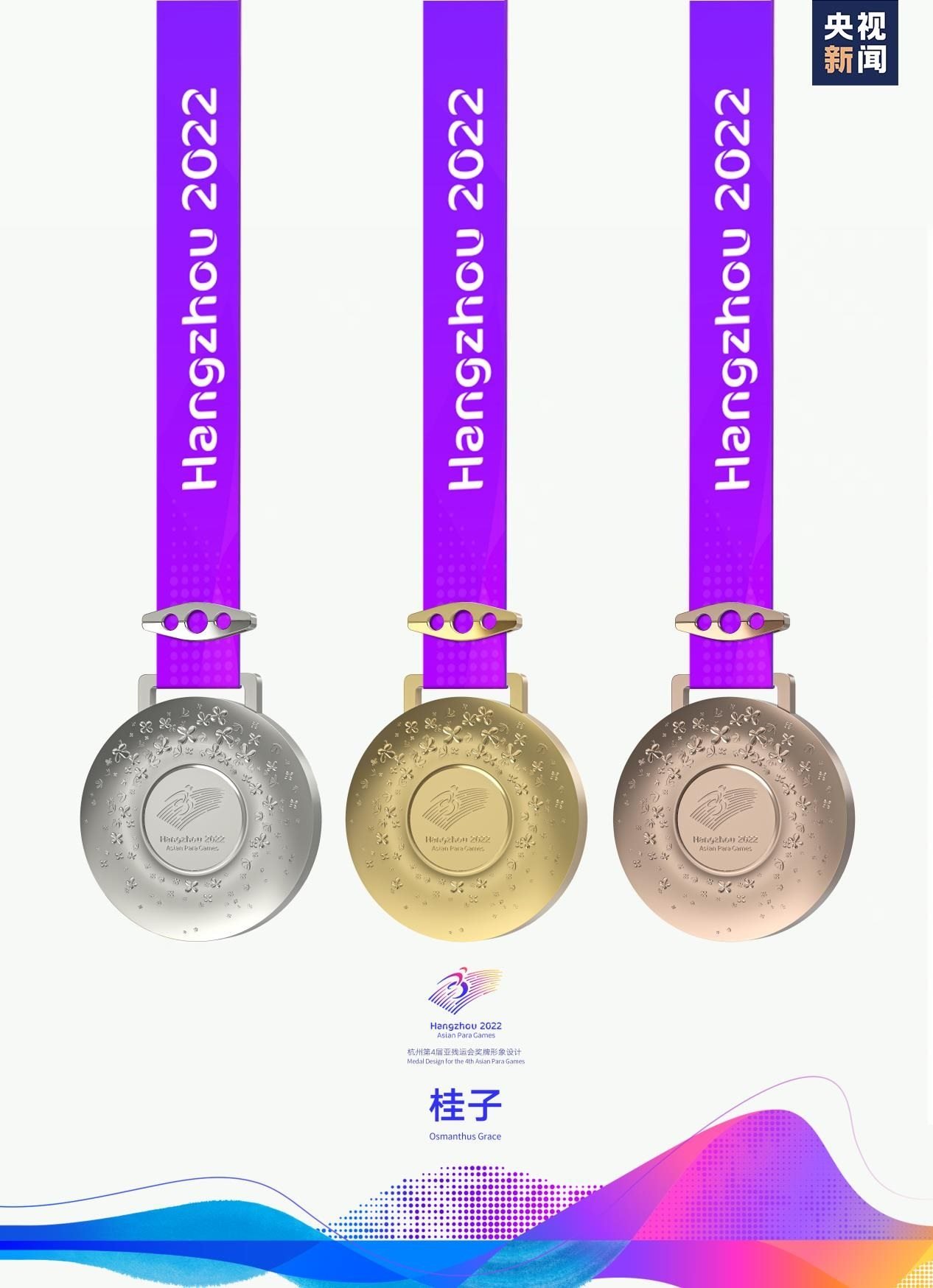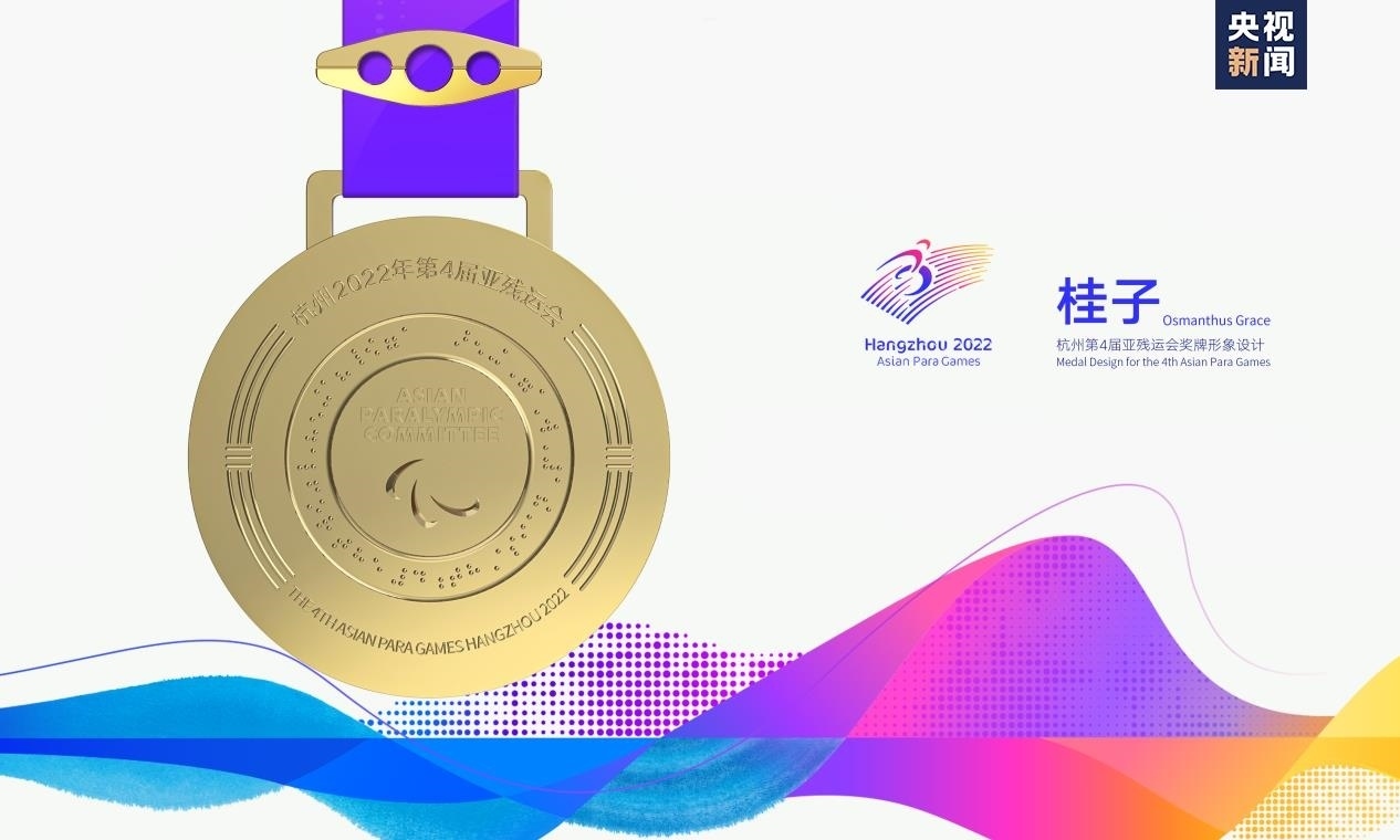 “桂子即桂花,素有金桂銀桂之分,暗合金牌銀牌?!睋?dān)任獎(jiǎng)牌設(shè)計(jì)團(tuán)隊(duì)主要負(fù)責(zé)人的中國(guó)美術(shù)學(xué)院工業(yè)設(shè)計(jì)副教授周波表示,“桂花是杭州市花,在丹桂飄香的金秋十月,我們相聚在杭州,整個(gè)城市都因它的綻放而香氣撲鼻。我覺(jué)得桂花是最好的意象表達(dá),漫天飛舞、靈動(dòng)飛逸的桂花飄灑在亞殘運(yùn)會(huì)會(huì)徽周?chē)恳涣⒙涞墓鹱泳秃帽葰埣策\(yùn)動(dòng)員奮勇向前,挑戰(zhàn)自我而獲得的一枚枚獎(jiǎng)牌。”