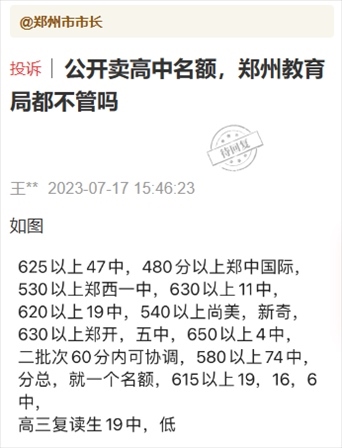 7月16日,有群眾通過頂端新聞“我想@領(lǐng)導”平臺向鄭州市教育局局長留言:“掏錢就能上?鄭州中招販賣名額成風”“公開賣高中名額,鄭州教育局都不管嗎”等類似留言。