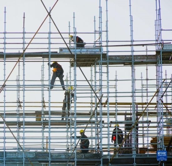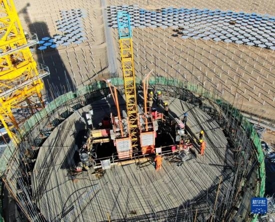 7月21日,在阿克塞千萬千瓦級可再生能源多能互補(bǔ)基地,工人在匯東新能源75萬千瓦光熱+項目建設(shè)現(xiàn)場施工。新華社發(fā)(馬曉偉 攝)