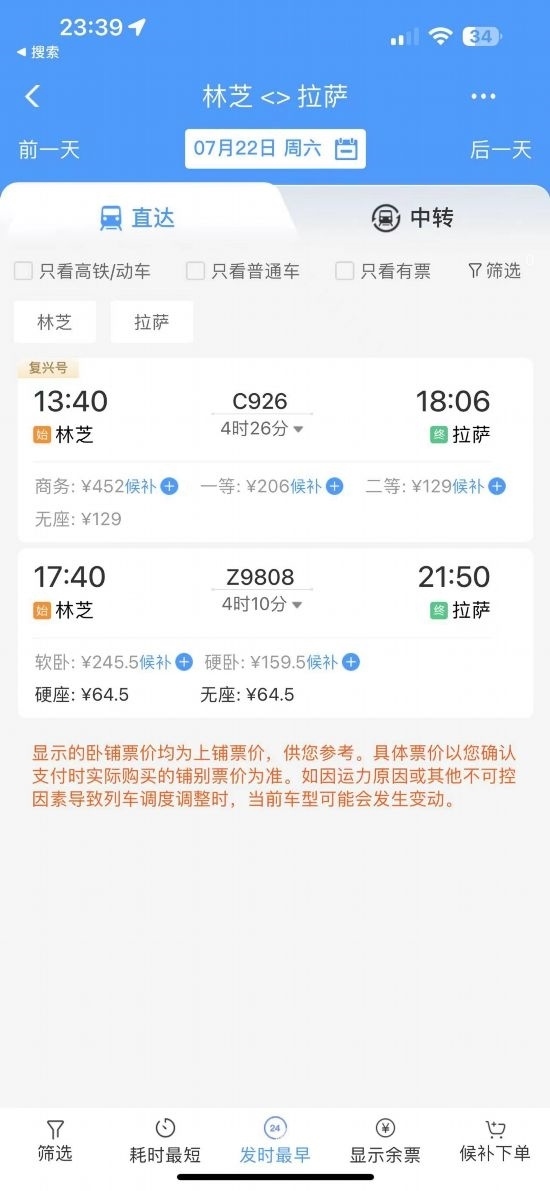 通過(guò)在鐵路售票APP上查詢發(fā)現(xiàn),從林芝開(kāi)往拉薩的復(fù)興號(hào)城際列車的二等座票價(jià)為129元,直達(dá)特快列車硬座為64.5元?!跋啾容^原先180元的客運(yùn)汽車票價(jià),直達(dá)特快列車便宜了近乎三分之一。”曹先生感慨地說(shuō)道。