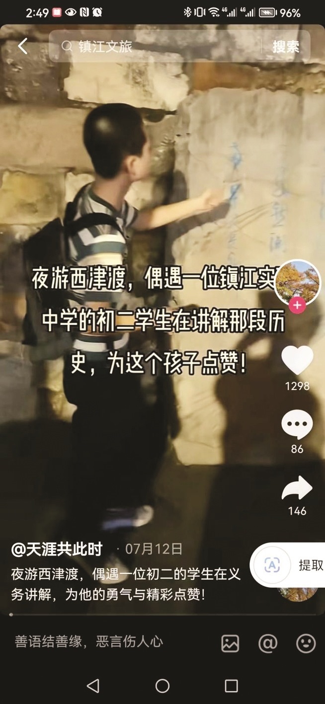 揚(yáng)子晚報訊(記者 萬凌云 通訊員 湯婉蓉 孫冬)“人類的歷史與功績會隨著時間而消失。但是中國將在他們身上繼續(xù)存在,我們將保持他們高舉的旗幟……”7月22日,一段鎮(zhèn)江初中學(xué)生講解歷史的視頻爆火,他們的講解地位于歷史底蘊(yùn)深厚的鎮(zhèn)江西津渡景區(qū)。