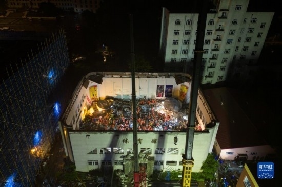 7月24日,消防救援人員在齊齊哈爾市第34中學(xué)體育館樓頂坍塌事故現(xiàn)場(chǎng)救援。新華社記者 張濤 攝