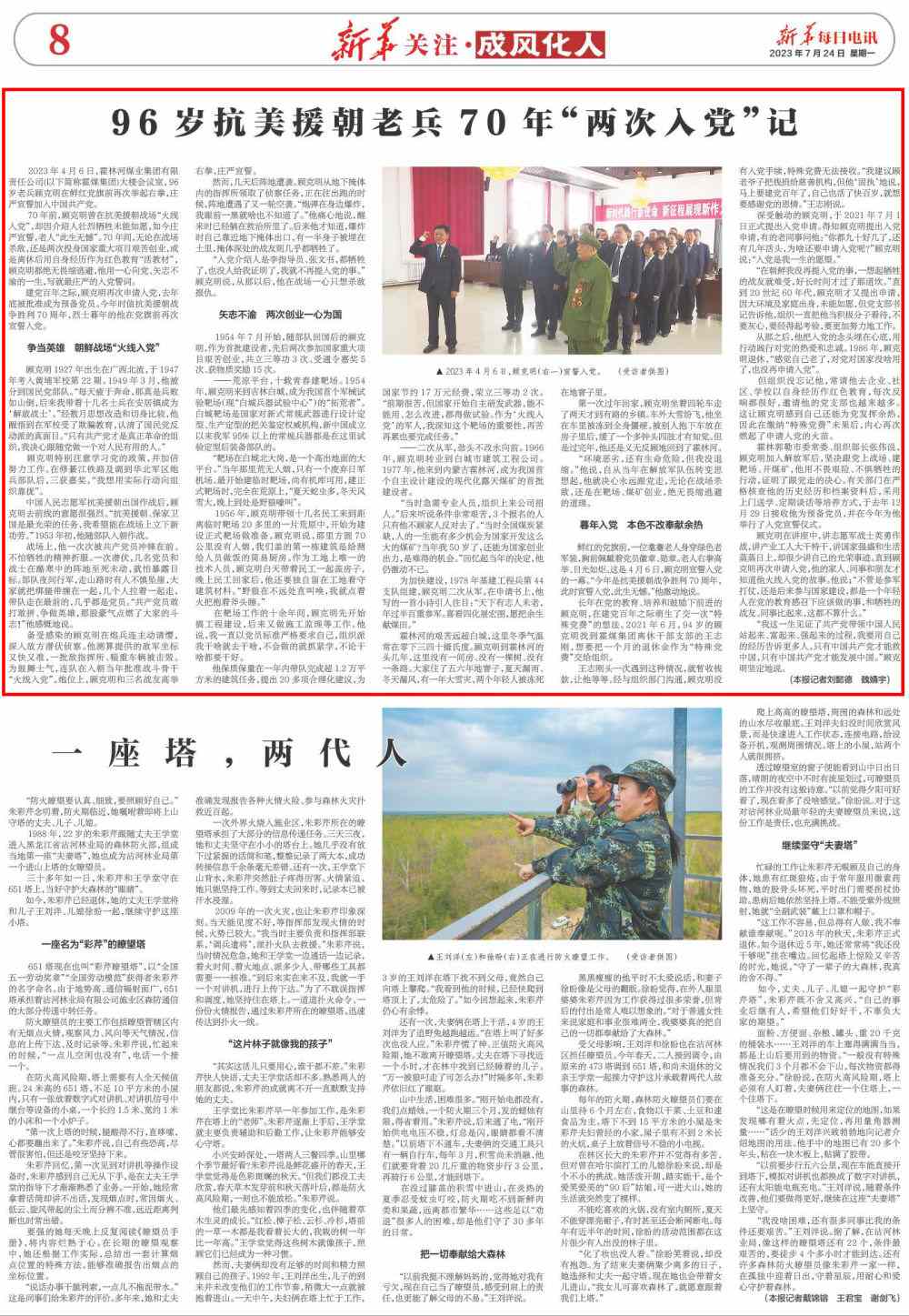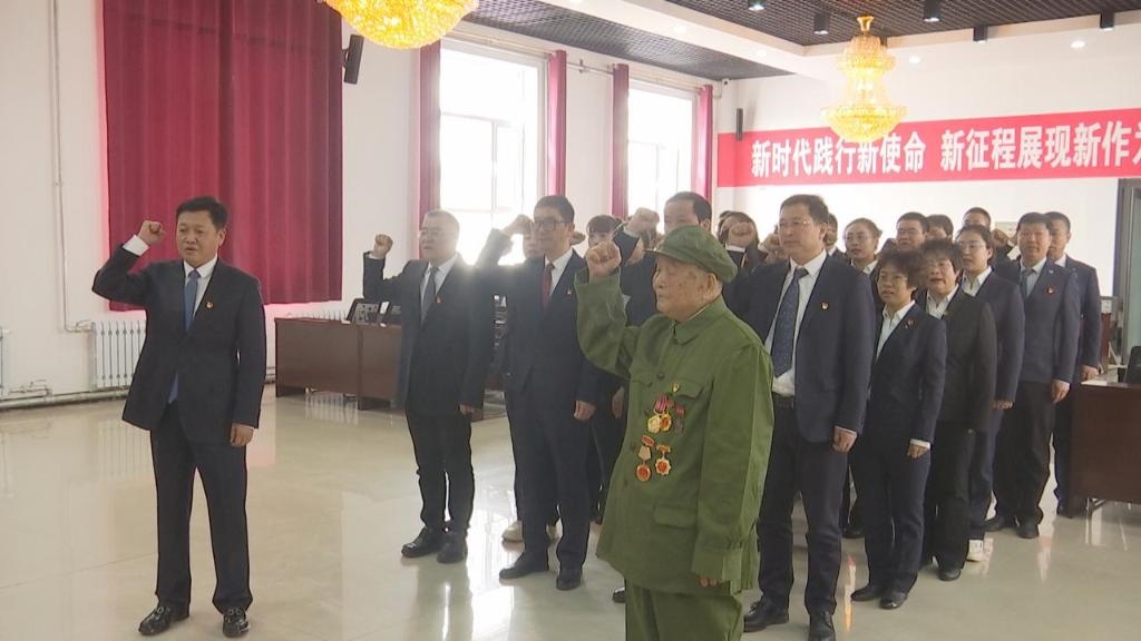 2023年4月6日,霍林河煤業(yè)集團(tuán)有限責(zé)任公司(以下簡稱霍煤集團(tuán))大樓會(huì)議室,96歲老兵顧克明在鮮紅黨旗前再次舉起右拳,莊嚴(yán)宣誓加入中國共產(chǎn)黨。