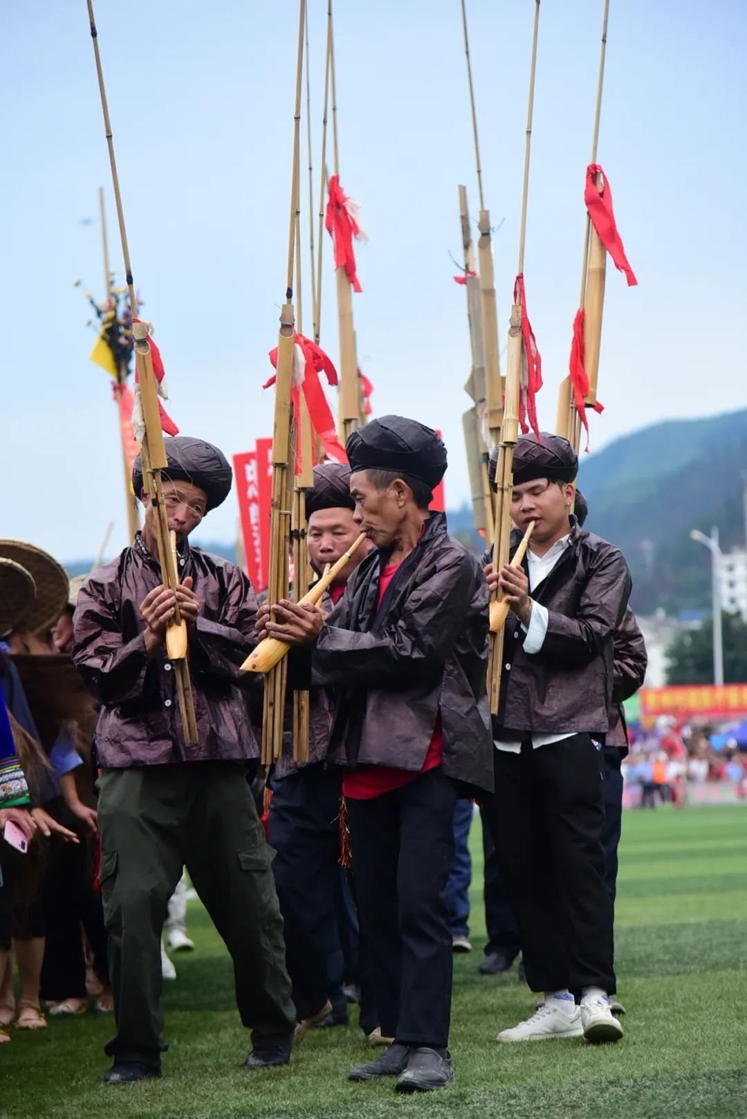 中場(chǎng)間隙,身著傳統(tǒng)服飾載歌載舞的拉拉隊(duì)走到綠茵場(chǎng)上,舞龍、吹蘆笙、唱侗歌……綠茵場(chǎng)秒變“民族大舞臺(tái)”。