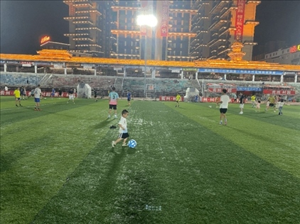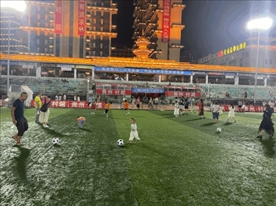 在比賽間隙和結(jié)束后,觀眾席上的孩子們會(huì)沖進(jìn)球場(chǎng),玩起傳球、盤帶和射門;工作日的晚上,“村超”體育場(chǎng)上,有很多踢球的身影,有中學(xué)足球隊(duì)的隊(duì)員,有八九歲的小學(xué)生,還有剛剛學(xué)會(huì)走路的小朋友。