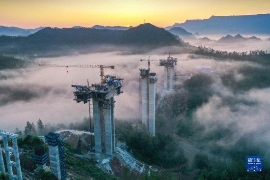 8月4日在湖南省湘西土家族苗族自治州龍山縣拍攝的桑龍高速公路灣檔河特大橋施工現(xiàn)場(無人機(jī)照片)。