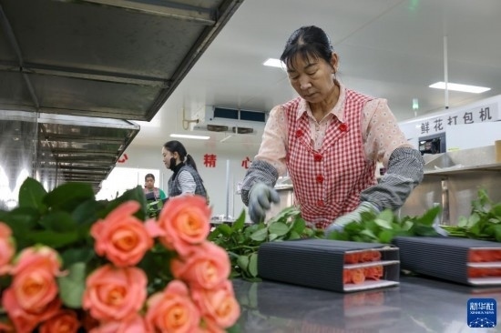 在云天化晉寧花卉產(chǎn)業(yè)現(xiàn)代化示范園內(nèi),花農(nóng)對鮮花進(jìn)行簡單打包(7月12日攝)。新華社記者 陳欣波 攝