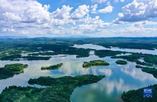 8月6日,湖南桂陽舂陵國家濕地公園,綠水、濕地、藍天相映成趣,構(gòu)成一幅秀美的夏日生態(tài)畫卷(無人機照片)。