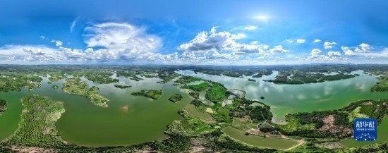 8月6日,湖南桂陽舂陵國家濕地公園,綠水、濕地、藍天相映成趣,構(gòu)成一幅秀美的夏日生態(tài)畫卷(無人機全景照片)。