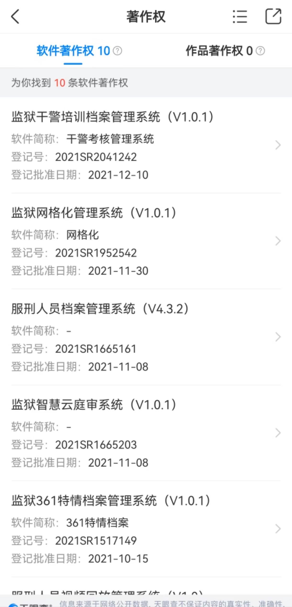 如上述立馳信息在官網(wǎng)中的自我介紹,澎湃新聞通過天眼查App檢索發(fā)現(xiàn),2021年一整年,立馳信息就獲批登記了包括上述“親情會見1.0”在內(nèi)的多個涉監(jiān)獄管理的系統(tǒng)。如監(jiān)獄固定資產(chǎn)管理系統(tǒng)、點名管理系統(tǒng)、服刑人員會見管理系統(tǒng)、監(jiān)獄干警培訓檔案管理系統(tǒng)等共計10項。