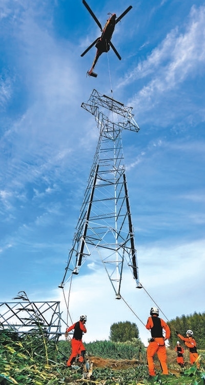 8月9日,國家電網(wǎng)公司調(diào)配直升機支援黑龍江電力恢復工作。圖為直升機在牡丹江海林110千伏海長線搶修現(xiàn)場整塔吊裝作業(yè)中。方 圓 張恩全攝影報道