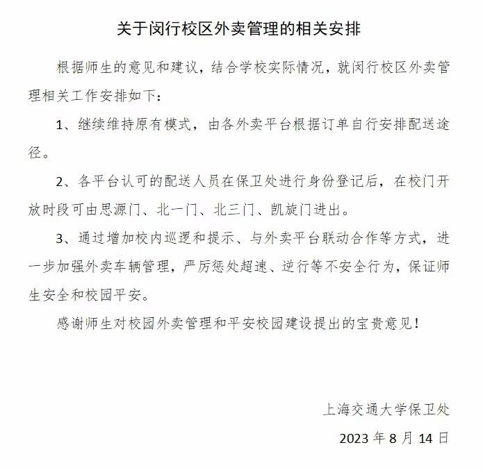 8月14日晚6點,有上海交大學(xué)生向記者反映,學(xué)校已更新關(guān)于閔行校區(qū)外賣管理的相關(guān)安排。安排顯示,維持原有模式,由各外賣平臺根據(jù)訂單自行安排配送途徑,各平臺認可的配送人員在保衛(wèi)處進行身份登記后,在校門開放時段可由學(xué)校四個校門進出;學(xué)校會通過增加校內(nèi)巡邏和提示,與外賣平臺聯(lián)動合作等方式,進一步加強外賣車輛管理,嚴(yán)厲懲處超速、逆行等不安全行為,保證師生安全和校園平安。當(dāng)晚,澎湃新聞記者了解到,閔行校區(qū)已有保安人員接到上級通知,維持原有模式,多名外賣騎手也從學(xué)校保安人員處獲知可正常進出校園。