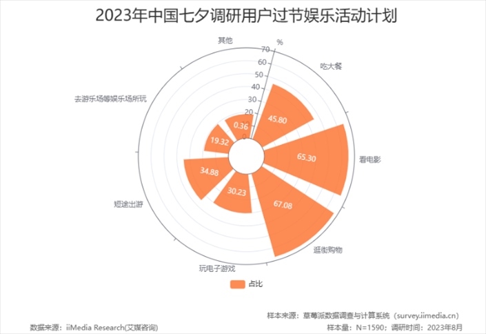 今年七夕恰逢工作日,大多數(shù)人選擇下班后再相聚?!爸袊?guó)七夕節(jié)日消費(fèi)行為大數(shù)據(jù)調(diào)查”顯示,2023年消費(fèi)者過(guò)節(jié)的娛樂(lè)活動(dòng)計(jì)劃TOP3分別為:逛街購(gòu)物、看電影、吃大餐。