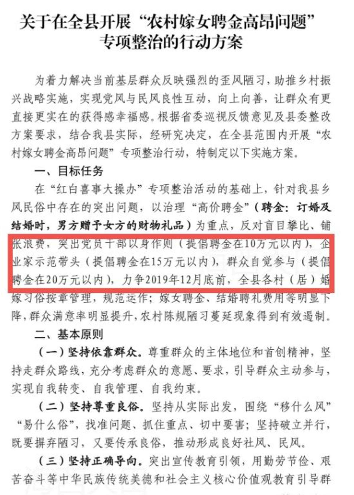 2019年,大田縣就曾發(fā)文,在全縣開展“農(nóng)村嫁女聘金高昂?jiǎn)栴}”專項(xiàng)整治行動(dòng),提倡黨員干部將聘金控制在10萬(wàn)元以內(nèi),企業(yè)家將聘金控制在15萬(wàn)元以內(nèi),群眾將聘金控制在20萬(wàn)元以內(nèi)。近來(lái),當(dāng)?shù)卣胃邇r(jià)彩禮的報(bào)道頻頻見諸媒體。
