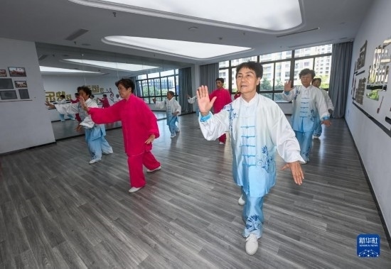 8月24日,在湖州市龍泉街道市陌河社區(qū),老人們在參加迎亞運健身活動。